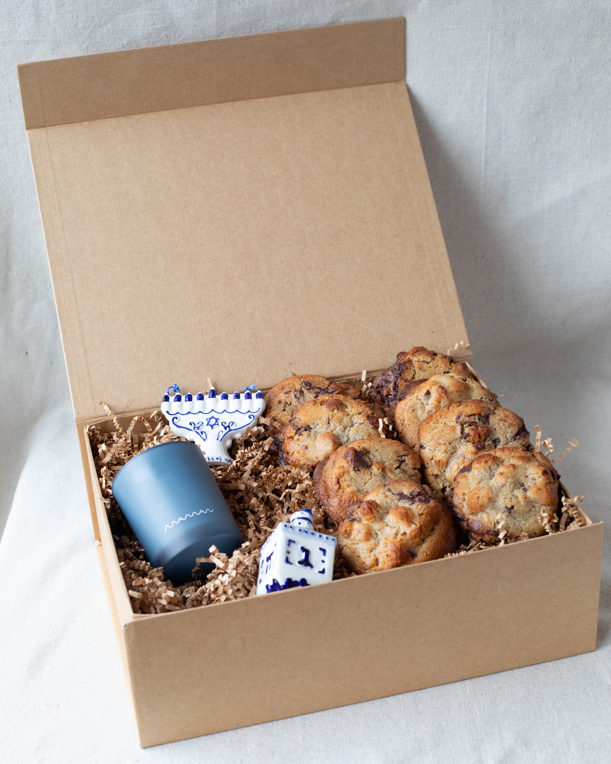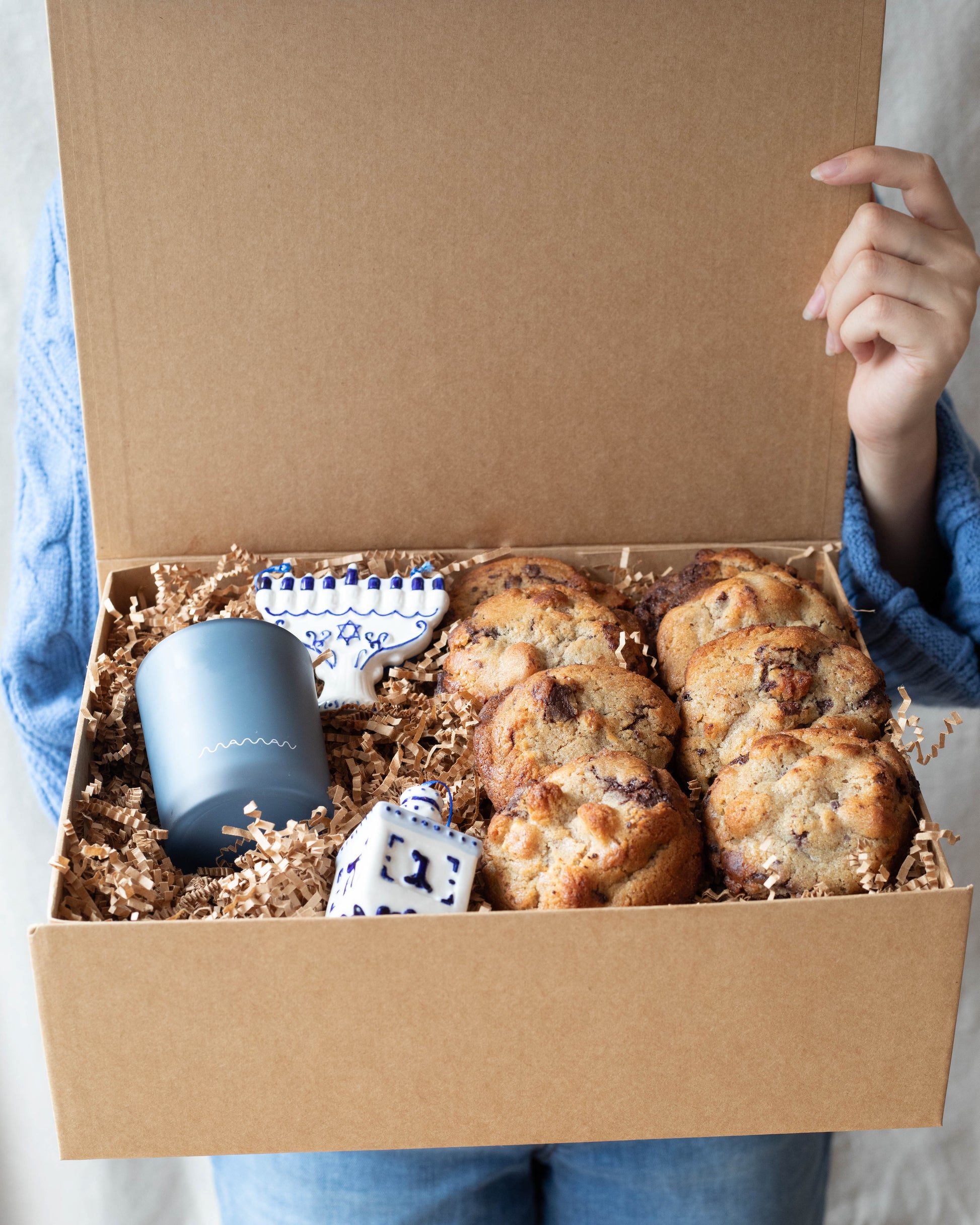 offrez quelque chose de sucré à vos proches en cette période des fêtes ! répandez la joie des biscuits à tous avec un délicieux assortiment de nos célèbres biscuits aux pépites de chocolat et aux noisettes {comme présenté sur les choses préférées d'Oprah}. célébrez les huit nuits de Hanoukka avec un pot de pièces de monnaie festives de Hanoukka {amusant pour tous les âges !} et une bougie maman à savourer dans le confort de votre maison.